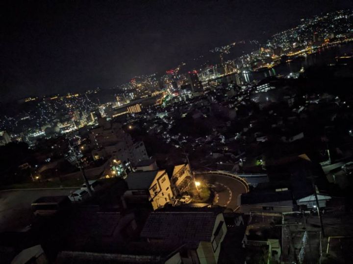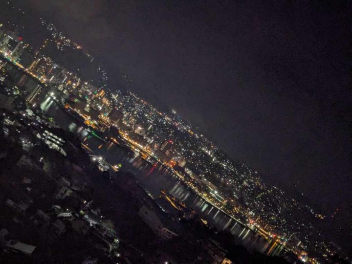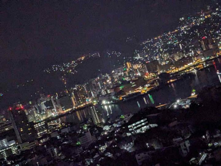 ホテル6Fプレミアムツインハーバービューからの夜景です。稲佐山の中腹にあり、高度もあるため長崎港方面が良く見渡せる非常に素晴らしい夜景となっています。山の斜面に住宅が建て込む長崎市の地形の特徴が非常に良く分かります。斜面のハートのイルミネーションも素敵ですね。さすが夜景都市長崎です。 公式サイトは登録されていません。 |