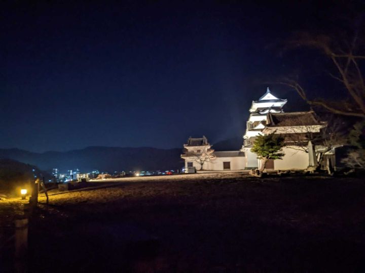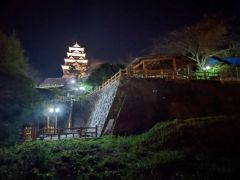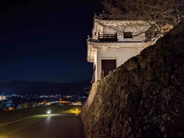大洲城は背後に流れる肱川を天然の堀として利用し、南側に二の丸、三の丸を配した梯郭式の平山城です。4棟の櫓が現存しています。また、明治の廃城令で天守は取り壊されましたが、2004年に木造で復元されました。夜間はライトアップされています。本丸は周囲よりも小高いところにあるため、大洲市街地の夜景を小規模ですが望むことができます。アクセスは伊予大洲駅から徒歩10分となっております。