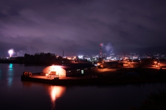 夜景の中心は、工場群の力強いオレンジ色の夜景で、その光が水面に反射しており、工場地帯にも関わらず、落ち着きのある夜景となっています。