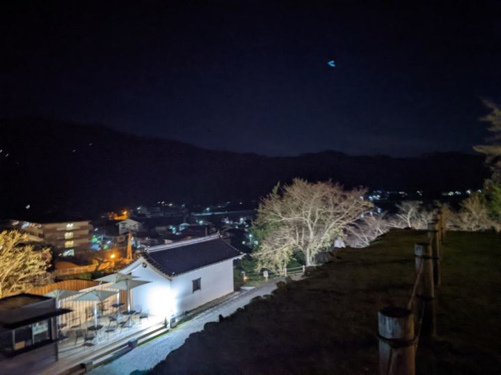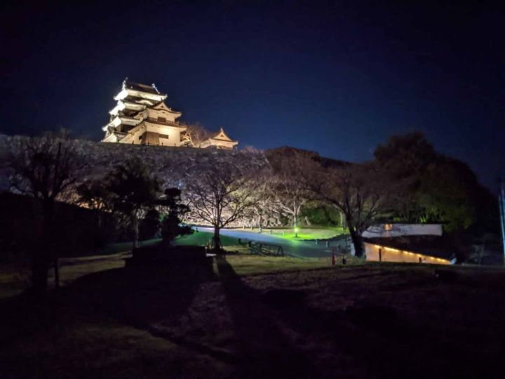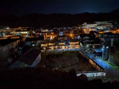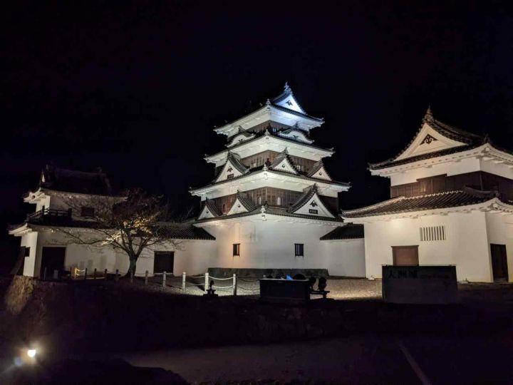 大洲城は背後に流れる肱川を天然の堀として利用し、南側に二の丸、三の丸を配した梯郭式の平山城です。4棟の櫓が現存しています。また、明治の廃城令で天守は取り壊されましたが、2004年に木造で復元されました。夜間はライトアップされています。本丸は周囲よりも小高いところにあるため、大洲市街地の夜景を小規模ですが望むことができます。アクセスは伊予大洲駅から徒歩10分となっております。